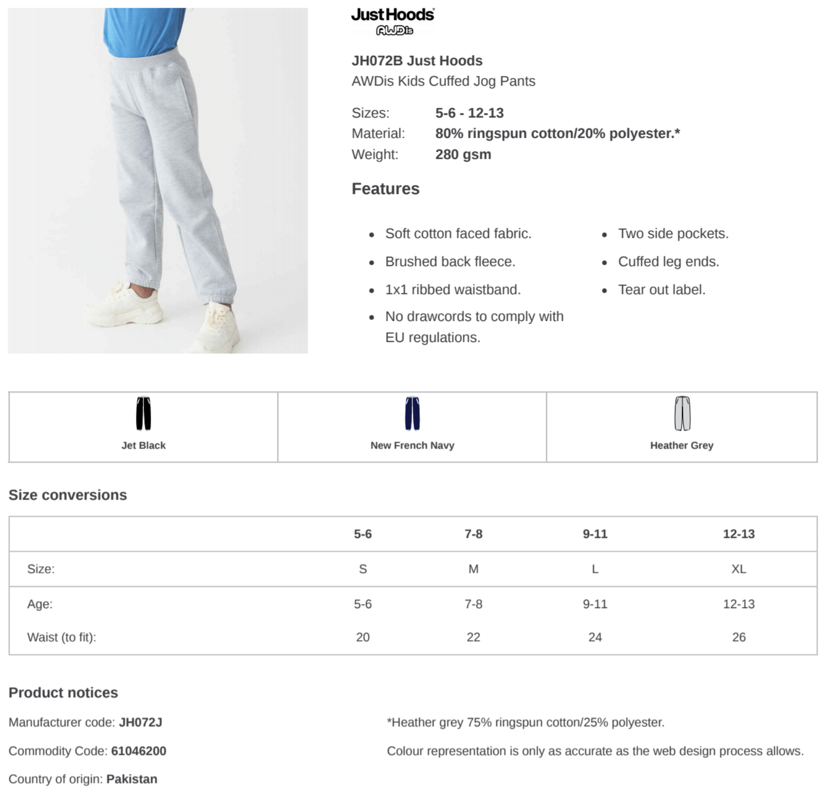 These classic print-ready jogpants are an ideal addition to any kid’s gym kit and are complete with a cuffed leg opening and comfortable elastic waitband.