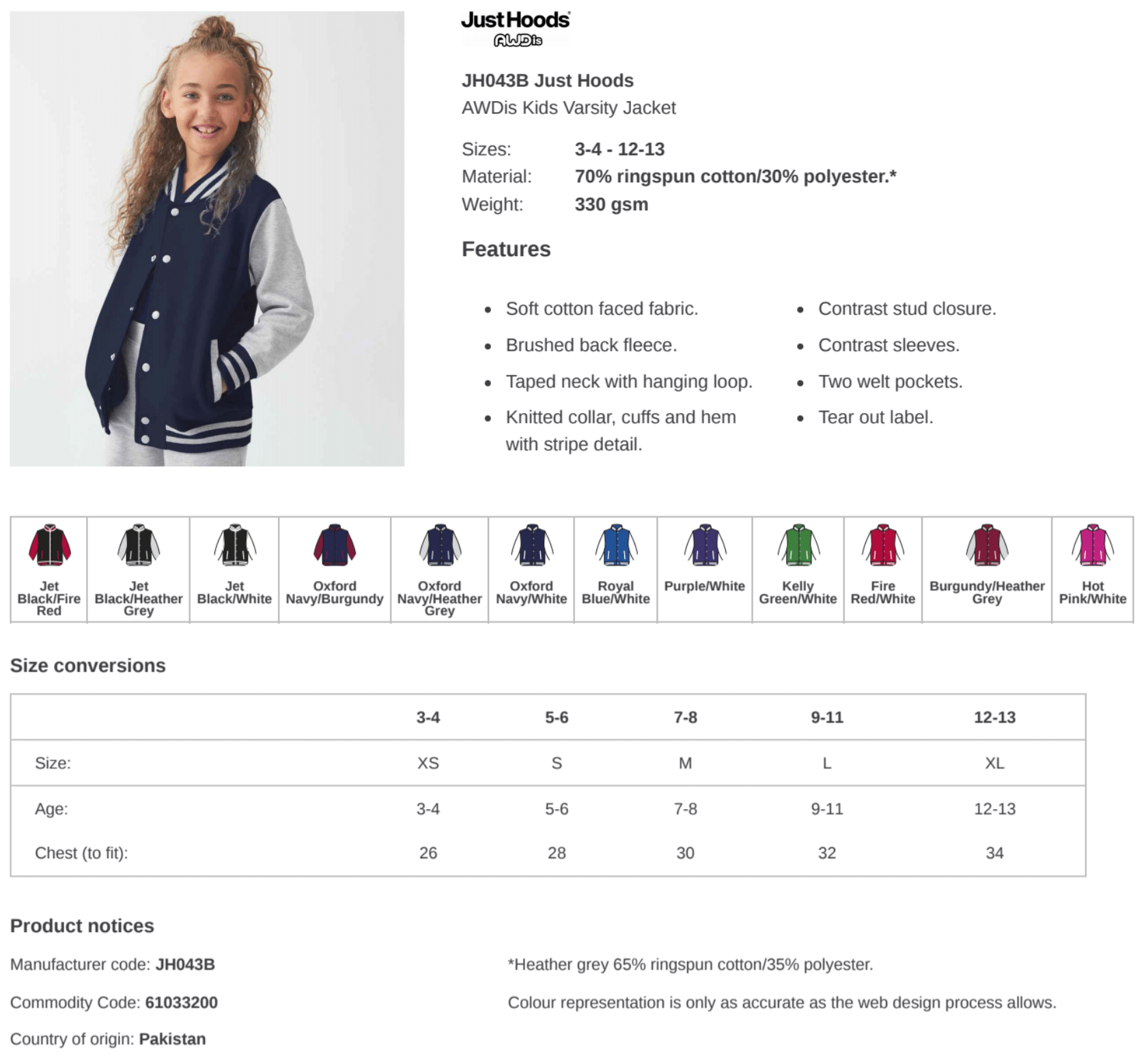 An American inspired kids varsity jacket, complete with contrast sleeves and poppers and fashioned from our easy to decorate heavyweight fabric.