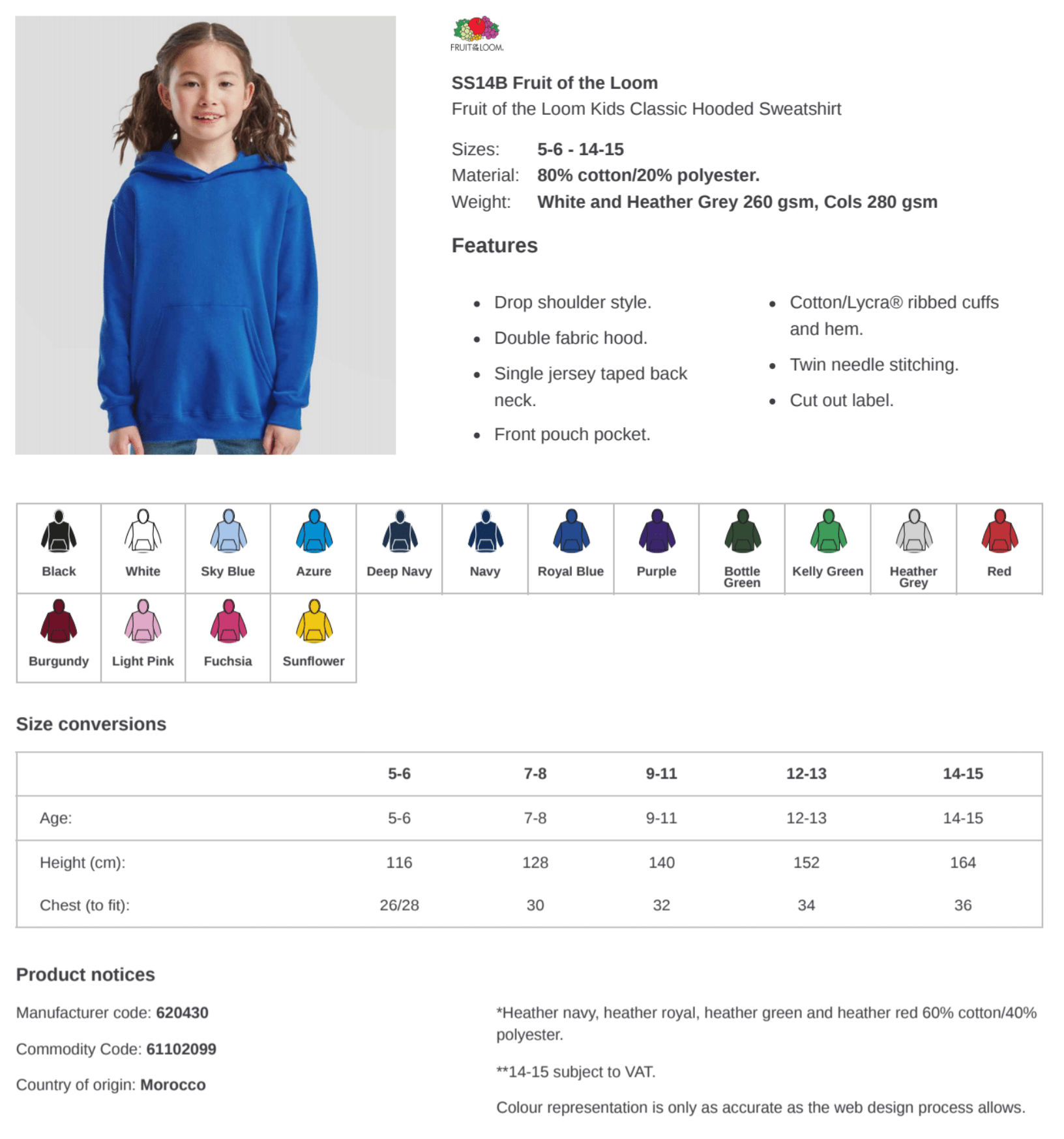 This Kids Hooded Sweat from the ever reliable Fruit of the Loom has everything you need in a kids hoodie. Tough & Hard Wearing means it will keep its colour and shape after whatever adventures lie in store. Designed to keep kids as comfortable as possible at all times and the Double fabric hood without drawcord is in line with European childrenswear legislation.
