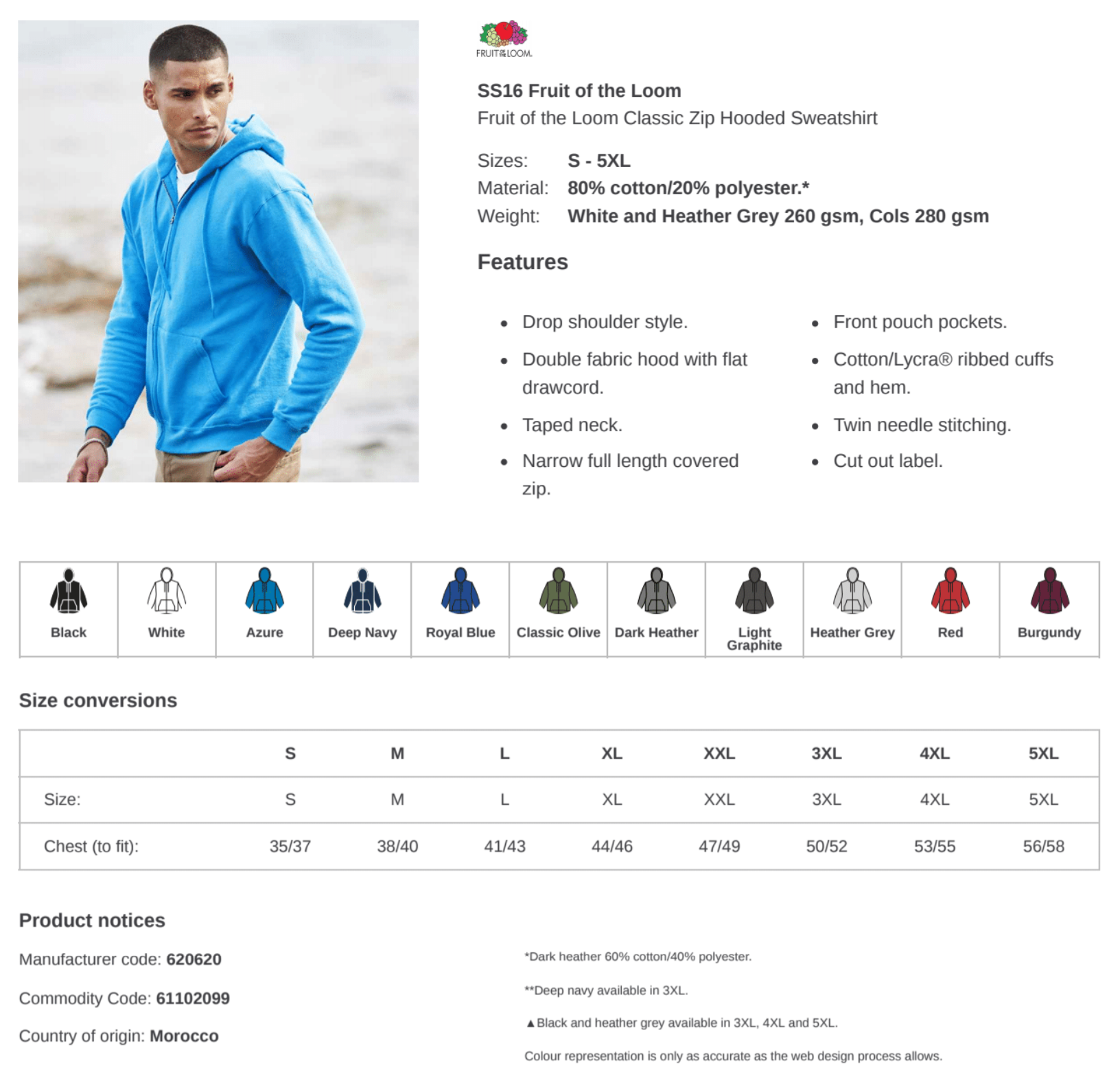 Details include set-in sleeves, full length YKK metal zip, Double fabric hood with self-coloured drawcord, deep front pouch pocket, Ribbed hem and cuffs for superior shape retention