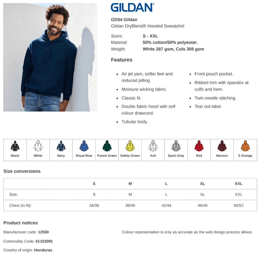 | Colour | G Ash, G Black, G Forest Green, G Maroon, G Orange, G Red, G Royal, G Safety Green, G Sport Grey, G White, Navy |