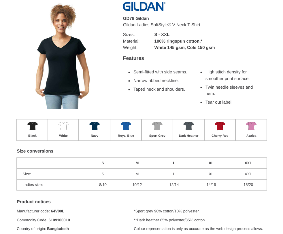 | Colour | G Azalea, G Black, G Cherry Red, G Dark Heather, G Navy, G Royal, G Sport Grey, G White |