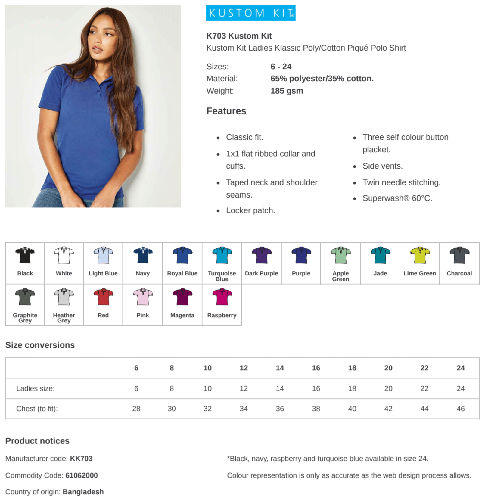 One of our best selling polo’s! Perfect for many types of Industries. Whether you’re a Landscaper, Sales Person or Nursery Practitioner! The original Kustom Kit polo is renowned for its superior quality, easy care properties and vast colour range. Made from 65% Polyester and 35% Cotton this Polo also features: flat knit collar and cuffs, Half moon yoke, Side vents, a spare button, Taped back, neck & shoulder seams and a Three button placket with a slanted top.