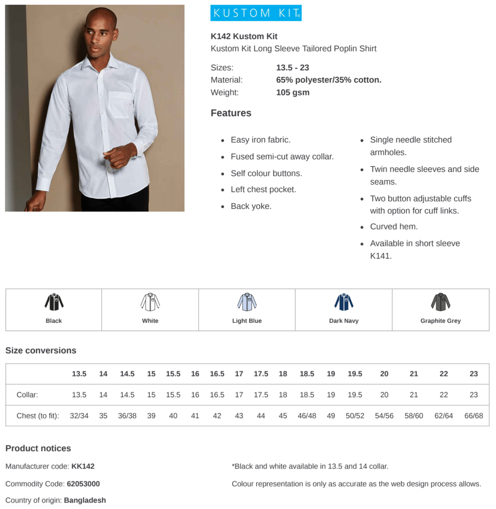 | Colour | KK Black, KK Dark Navy, KK Graphite Grey, KK Light Blue, KK White |
