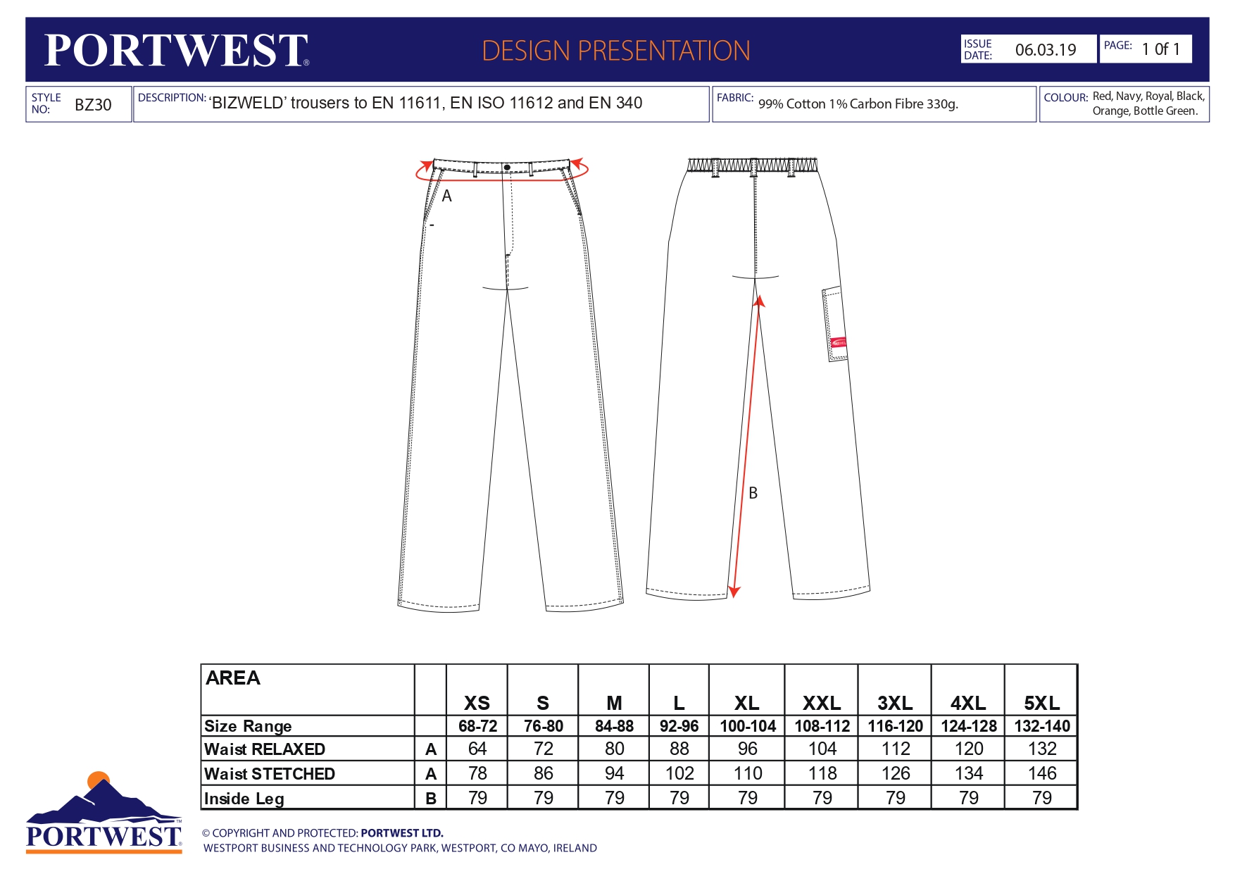 Designed to give maximum protection and comfort to the wearer, the Bizweld Trousers will keep you safe. The garment has twin stitched seams for extra strength and side pockets with a conveniently placed rule pocket for quick and easy accessibility. Compliant with ELIM TESTING IN PROGRESS, EN ISO 11612 A1+A2, B1, C1, E2, F1, EN ISO 11611 Class 1 A1+A2, ASTM F1959/F1959M-12 ATPV 11.2 CAL/CM2 (HAF = 80.4%). Also features: CE-CAT III, Dual hazard protection, Side pockets, Rule pocket, Half elasticated waist for a secure and comfortable fit, Twin-stitched seams for extra durability, 50+ UPF rated fabric to block 98% of UV rays,