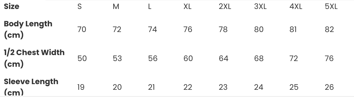 | Sizes | XS, S, M, L, XL, 2XL, 3XL, 4XL, 5XL |