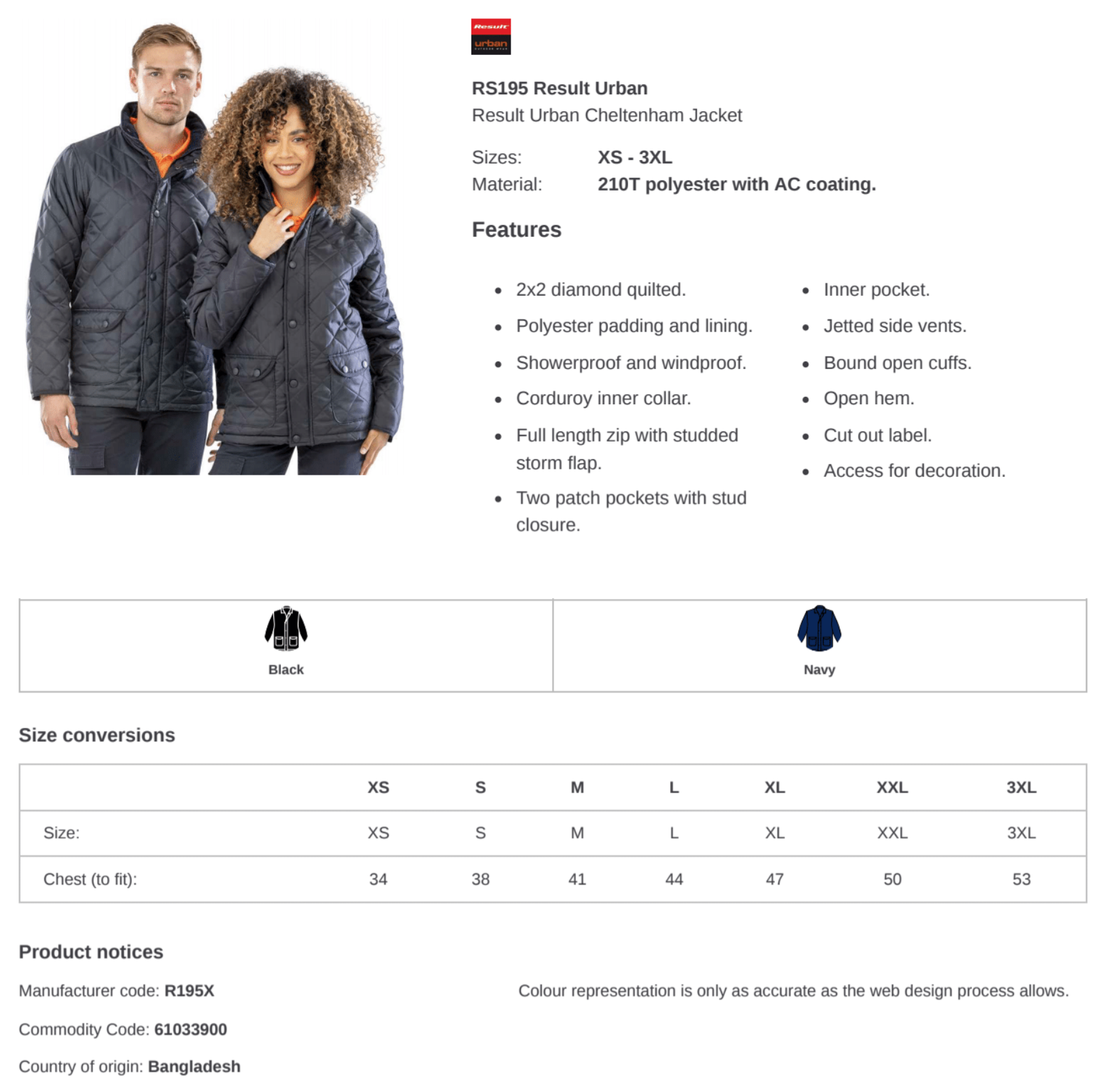 The outer of this Jacket is made from diamond quilted 210T 100% Polyester taffeta with A/C coating giving you the country outdoors look. The inner has 4 oz of Polyester padding to keep you warm. Features also include: a Corduroy collar, Stud closing front storm flap, Full length zip closing, Two patch side pockets and Jetted side vents