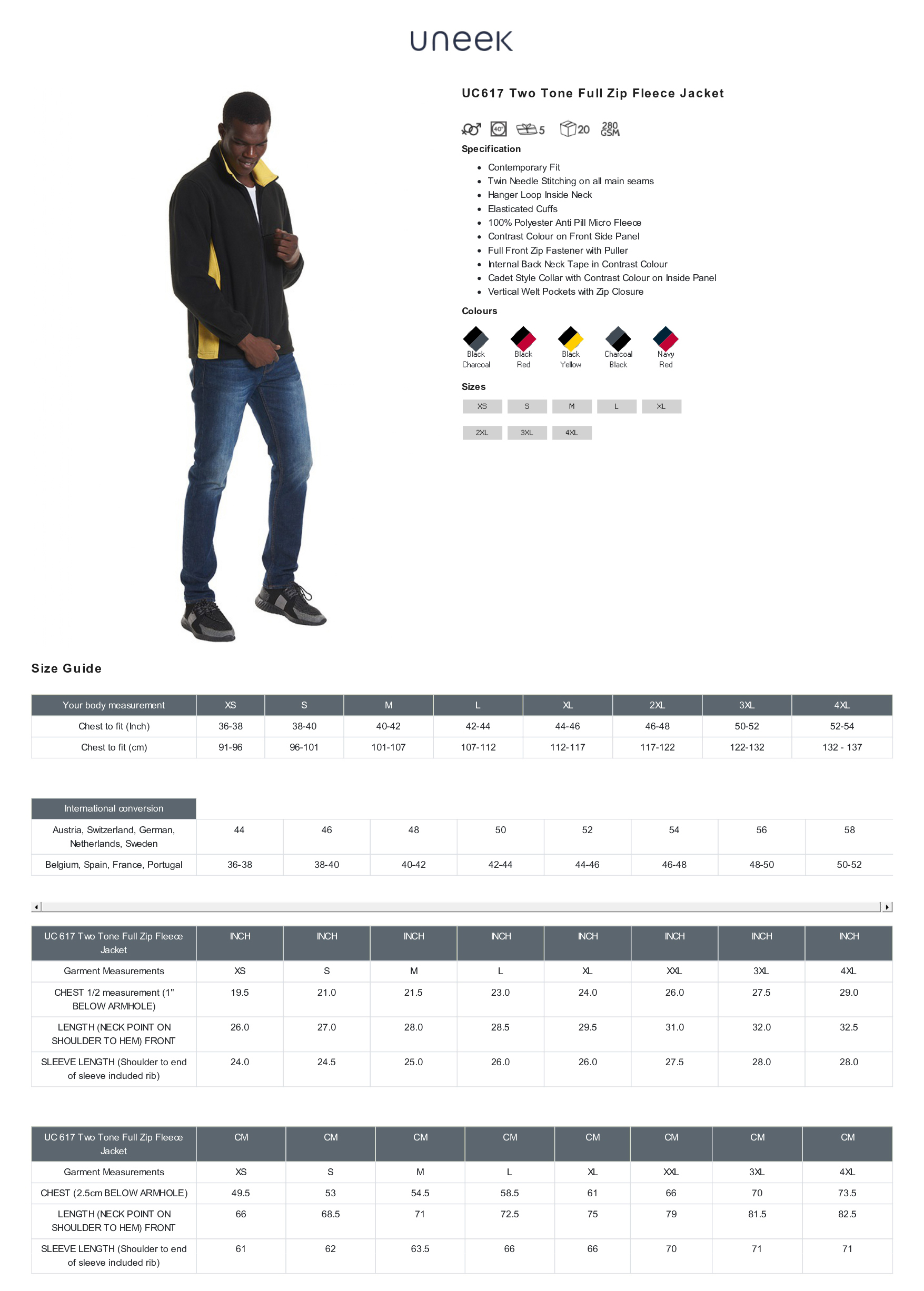Part of the Uneek Two Tone Range – Check out our UC107 Polo or type in the Search bar Two Tone! Made from 100% polyester the anti pill material ensures no unsightly bobbles will appear after washing, while the elasticated cuffs and pull cords will keep the chill off of your arms and back. Everything is kept secure in the zip pockets and the cadet style collar is smart and keeps you as snug as a bug. Other features include: twin needle stitching, full self coloured zip and hanger loop inside neck.