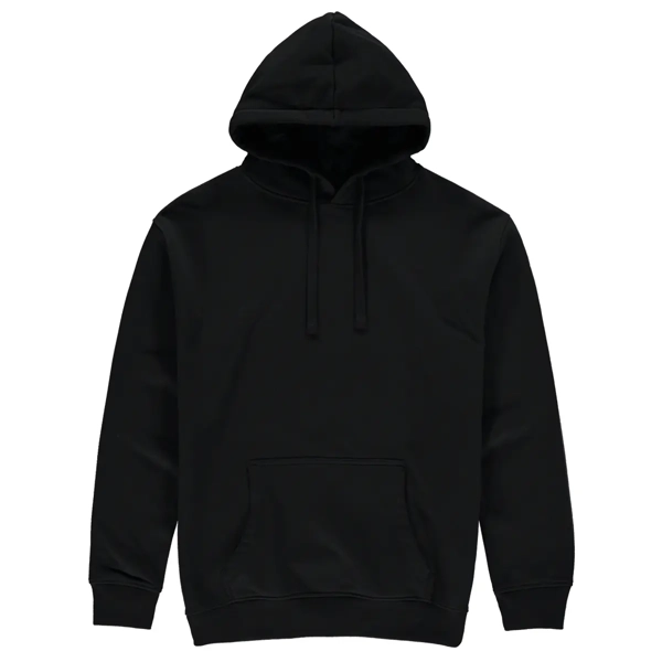 Men’s over the head hoodie. Self-colour jersey lined hood. Jersey binding to back neck. Taped back neck. Self-fabric full needle rib double layered cuff and welt. Flat lace drawcord turned up ends. Central kangaroo pocket with double stitching. Vanilla adhesive back neck sticker.