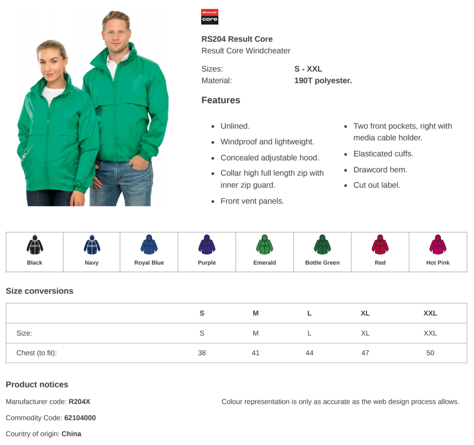 This incredibly light, easy care product offers great weather and windproof protection in an effective unfussy package that folds down neatly. With Breathable front chest vent panels, Concealed hood in the collar with an adjuster you are sure to be kept warm when needed and cool if on the go. Featuring a Full front zip fastening & 2 zipped front pockets you’re belongings will be kept close by while the cable holder located in right hand pocket will keep your ipod safe. Also made from recycled materials meaning you’re doing you’re bit for our planet!