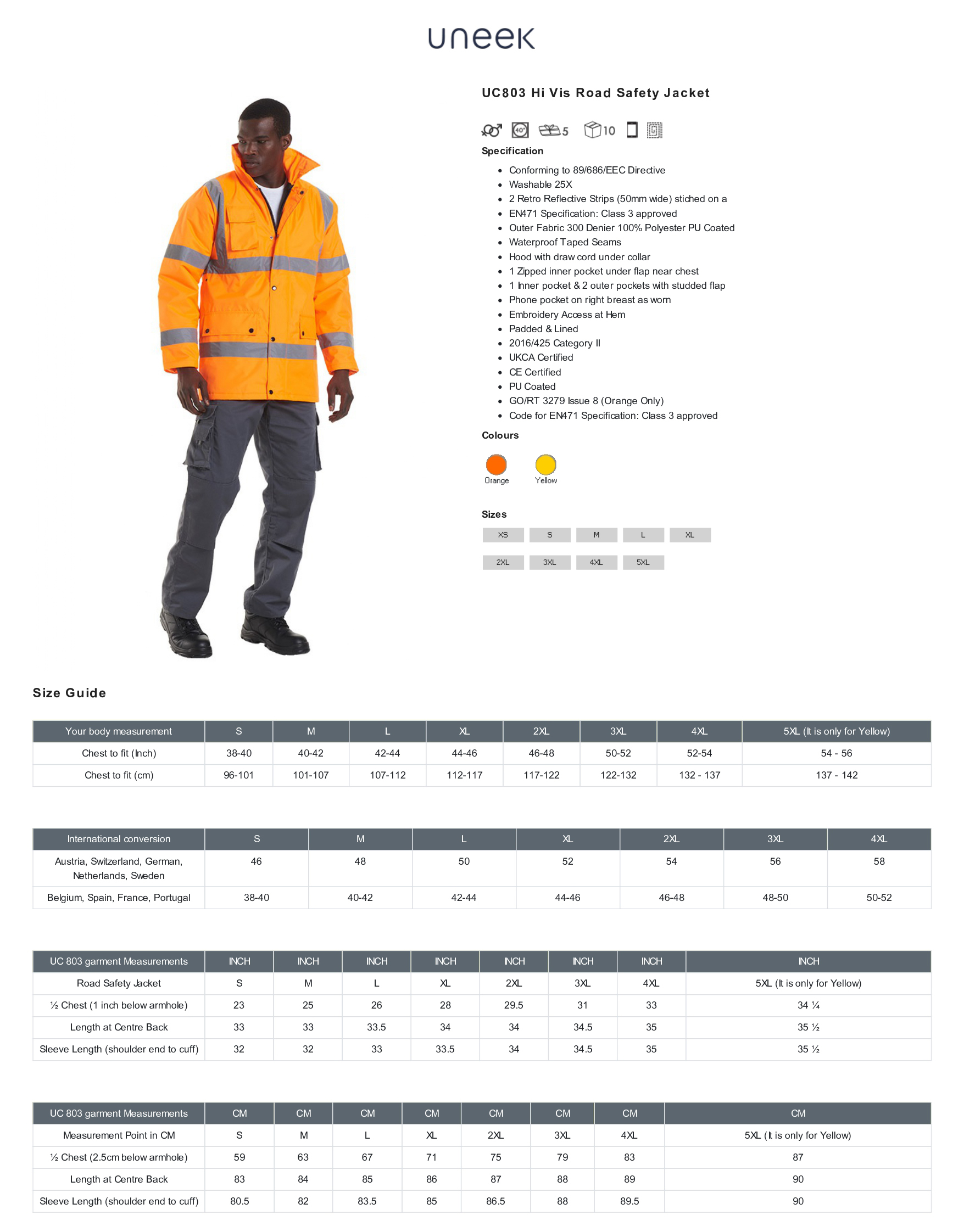 Complies with to EN ISO 20471:2013 Class 3 Approved, EN343 Class 3:1 Approved, GO/RT 3279 Issue 8 (Orange Only), 89/686/EEC Directive. The Outer Fabric is 300 Denier 100% Polyester PU Coated, Waterproof taped seams, 2 Retro Reflective Strips (50mm wide) stitched on and around the arms with one over each shoulder. Also features a hood with a drawcord under the collar, 1 zipped inner pocket under the flap near the chest, 1 inner pocket & 2 outer pockets with a studded flap, phone pocket on the right breast. Padded & lined for when stood at the roadside in the cold. Washable 25x.